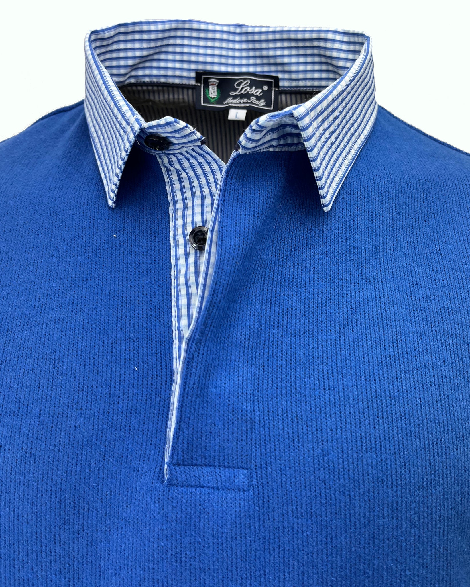 Realizzata in tessuto 80% cotone 20% Poliestere con polsini in tinta e colletto stile camicia in tessuto 100% Cotone azzurro.