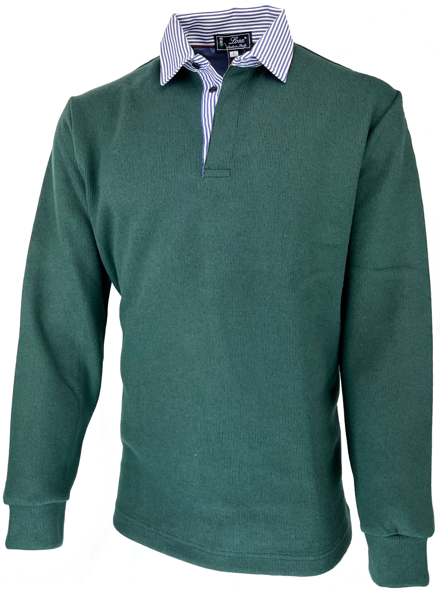 Realizzata in tessuto 80% cotone 20% Poliestere con polsini in tinta e colletto stile camicia in tessuto 100% Cotone Rigato Blu Bianco.